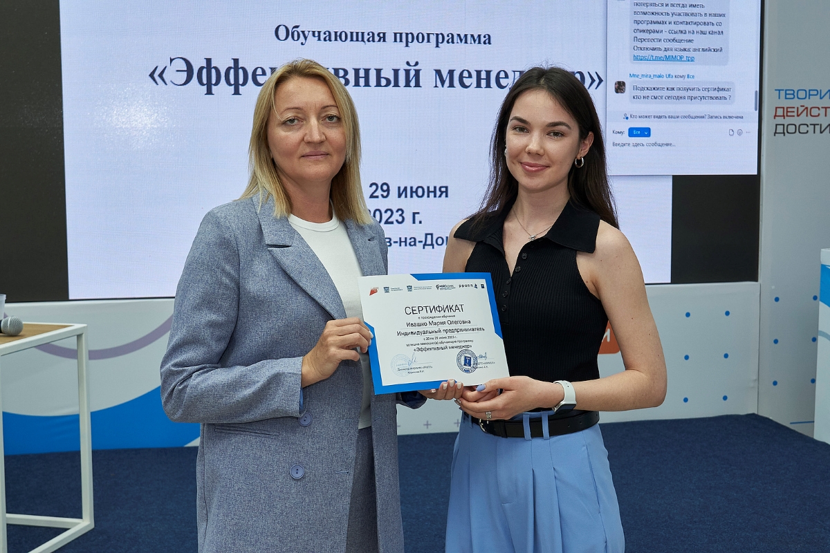 В завершение финального дня Светлана Абдулазизова , вице-президент ТПП Ростовской области, Яна Куринова , директор АНО МФК «РРАПП», Анна Палагина , ректор МИМОП и Оксана Стуковина , руководитель центра «Мой бизнес» Ростовской области подвели итоги образовательной программы и вручили участникам сертификаты.