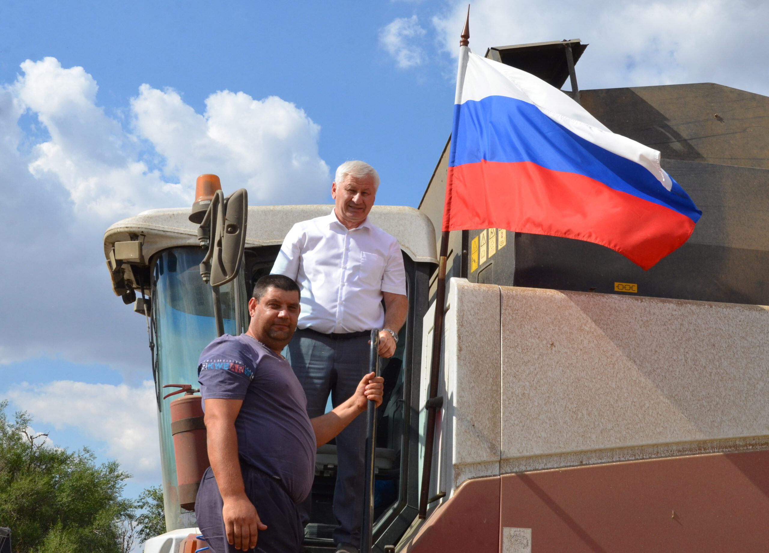 Вместе с лучшим комбайнером СПК «Подгорное» Яковом Петиным глава Администрации района в авангарде колонны комбайнов под флагом Российской Федерации провел обмолот на последних гектарах жатвы-2022.