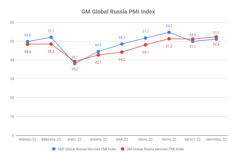 Сентябрьское значение индекса деловой активности ГлобалМедиа PMI (GM Global Services Russia PMI Index) составило 52,3 п.п. против 51,1 п.п . в августе. Значение индекса деловой активности в сфере услуг от S&P Global (Global Russia Services PMI by the S&P Global) за аналогичный период показал рост с 49,9 до 51,1 п.п.