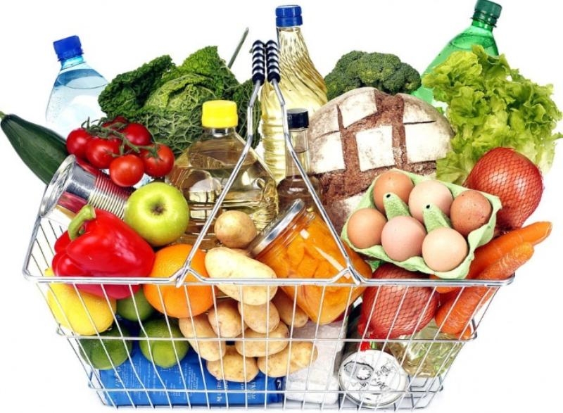 В продуктовую корзину входят самые необходимые товары: мясо, рыба, молоко, молочные продукты, яйца, растительное масло, маргарин, хлеб, макароны, крупы, бобовые, бахчевые, картофель, свежие фрукты, сахар и кондитерские изделия, а также соль, чай и специи.