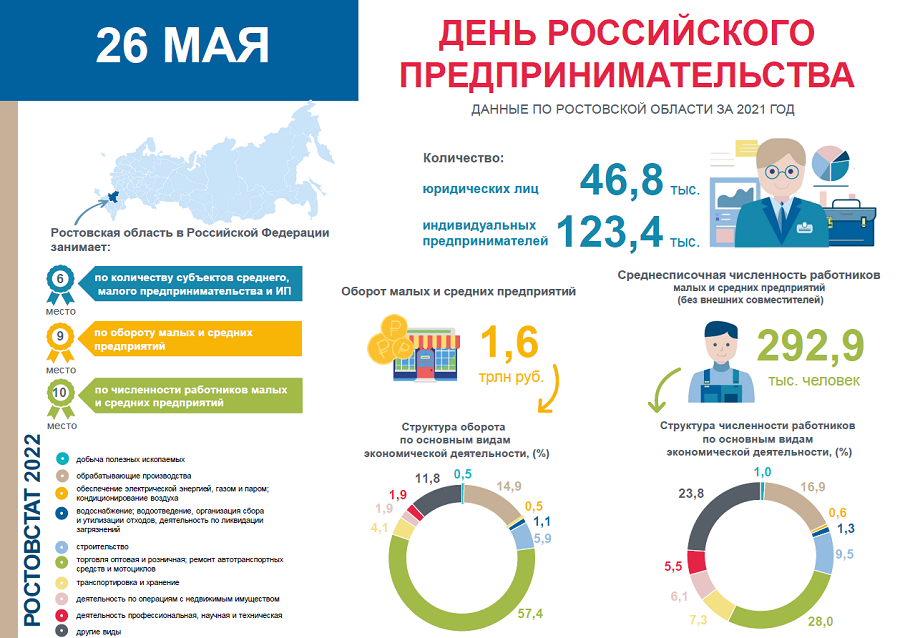 Важность среднего и малого бизнеса для экономики государства неоспорима. Доказать это могут данные статистики. В День российского предпринимательства, который отмечается ежегодно 26 мая, расскажем о среднем и малом бизнесе в Донском регионе. На начало 2022 года в Ростовской области насчитывалось почти 47 тыс. малых и средних предприятий и более 123 тыс. индивидуальных предпринимателей. В рэнкинге регионов России по числу субъектов малого и среднего предпринимательства наш регион занимает 6 место после Москвы, Московской области, Санкт-Петербурга, Краснодарского края и Свердловской области. В экономике области почти треть валового регионального продукта приходится на малый и средний бизнес. По итогам 2021 года совокупный оборот малых и средних предприятий Дона составил порядка 1,6 трлн рублей. Более половины оборота малых и средних предприятий Ростовской области (57,4 %) приходится на сферу торговли, значителен также вклад предприятий промышленности (около 17 %), сельского хозяйства и строительном секторе (примерно по 6 %). Всего в сфере малого и среднего бизнеса в 2021 году занято почти 293 тыс. человек. Большая часть из них - 27 % - специализируется на торговле, 21 % задействованы в промышленности, 9 % - в строительстве, 8% - в сельском хозяйстве. Более детальная информация, отражающая вклад субъектов малого и среднего предпринимательства в развитие региона и муниципальных образований области, будет представлена в июле текущего года, после подведения итогов сплошного федерального статистического наблюдения за деятельностью субъектов малого и среднего предпринимательства.