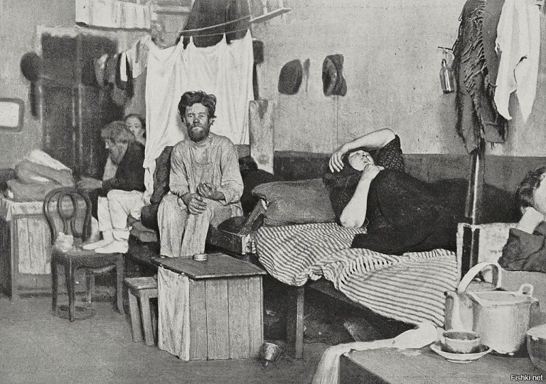 А ведь ещё недавно официальная пропаганда так любила ввернуть фразочку про то, как в СССР коммунисты всех загнали в коммуналки. Говорилось это с таким апломбом, что, надо понимать, в Российской империи все жили если не в личных особняках, то хотя бы в квартирах в доходных домах. Но люди, знакомые с историей, помнят, что такое рабочие казармы и «углы» в них, где за фанеркой, а то и просто за грязной простынёй ютилась целая рабочая семья с несколькими детьми. Да и в доходных домах рабочие если и снимали комнату, то зачастую одну на 2—3 семьи, выгораживая в ней всё те же «углы». Про санитарные условия такого проживания можно только скорбно промолчать.