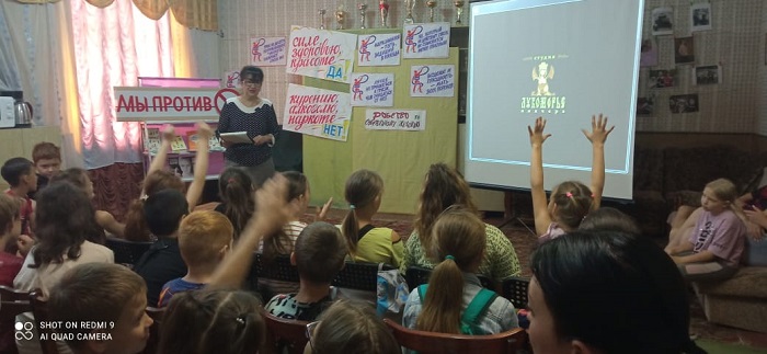 Для детей летних школьных лагерей школ №41 и №43 сотрудники библиотеки им. А. Л. Барто совместно с ДК им. М. П. Чиха провели беседу, направленную на профилактику наркомании и пропаганду здорового образа жизни.