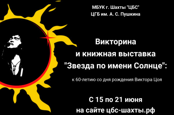 Центральная городская библиотека им. А. С. Пушкина приглашает всех желающих принять участие в викторине «Звезда по имени Солнце», посвященной 60-летию со дня рождения легенды русской рок-музыки Виктора Цоя.