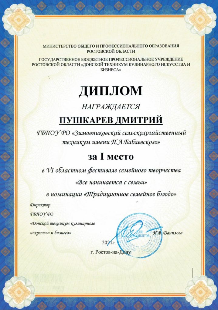 Так вот студент нашего Зимовниковского сельскохозяйственного техникума имени П.А. Бабаевского Дмитрий Пушкарёв принял участие в данном фестивале и стал победителем в номинация: «Традиционное семейное блюдо». Он на суд жюри представил традиционное семейное блюдо – запечённый сом и поделился его рецептом.