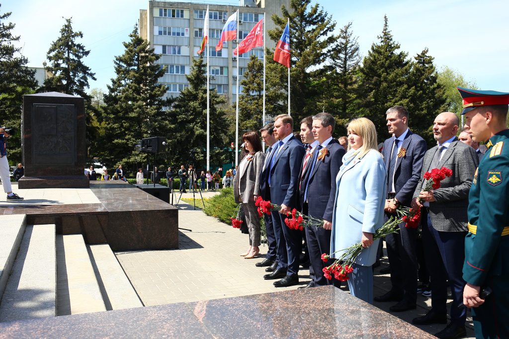 Сегодня, накануне Дня Великой Победы, состоялась церемония возложения венков и цветов к стеле «Ростов-на-Дону – город воинской славы» на проспекте Шолохова.