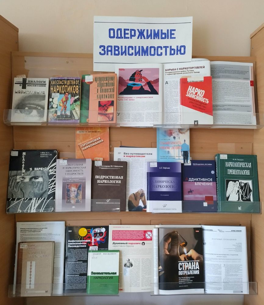 Библиотека РостГМУ подготовила к этой дате книжную выставку « Одержимые зависимостью» , на которой представлена литература из своего фонда. С книгами, представленными на выставке, можно познакомиться в читальном зале справочно-информационного фонда (УЛК, 2 эт., к. 219).