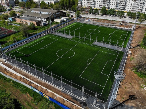 Монтаж синтетического газона голландского производства осуществили специалисты компании «ЕНГО». Также установлены и уже подключены шесть мачт освещения (максимальный режим 250 люкс), нанесена разметка полей, идет благоустройство территории. Ранее были смонтированы трубопроводы для дренажа и спринклеров системы полива, выполнены работы по устройству локальных очистных сооружений, которые уже подключены к городским сетям канализации, чтобы обеспечить правильную работу дренажной системы футбольного поля. Сейчас прорабатывается вопрос по установке раздевалок, скамеек запасных и трибун для зрителей.
