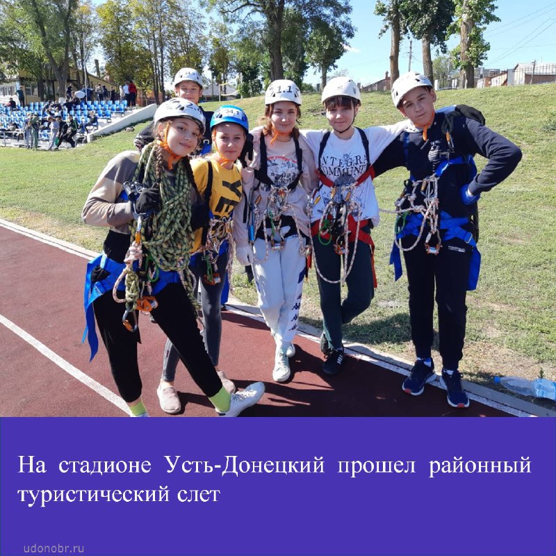 На стадионе «Водник» в Усть-Донецком прошел районный туристический слет. В туристическом слете приняли участие все школы Усть-Донецкого района. Турслет прошел по программе: техника пешеходного туризма, спортивное ориентирование и командная тактико-техническая дистанция. По уже сложившийся традиции соревнования проводились по двум подгруппам А и Б (старшая и младшая возрастная категория).