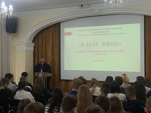 Приглашенный специалист семинара – представитель духовенства, давний друг ТИУиЭ, настоятель Ильинского храма в городе Таганроге, иерей отец Павел Дудоладов обратился к аудитории, оперируя интереснейшими теологическими, историческими фактами. Святой отец призвал ребят быть добрее, открытее, ценить каждую минуту жизни, то, что имеется здесь и сейчас, и не забывать о важности сохранения жизни.