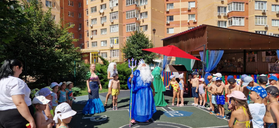 В гости к дошколятам пришел царь морской Нептун с русалками. Дети ждали гостей с нетерпением, ведь все любят плескаться, соревноваться в ловкости и смелости. А ещё конечно играть с Нептуном и его друзьями в весёлые игры. Удивительный праздник подарил Нептун ребятам в жаркий летний день!