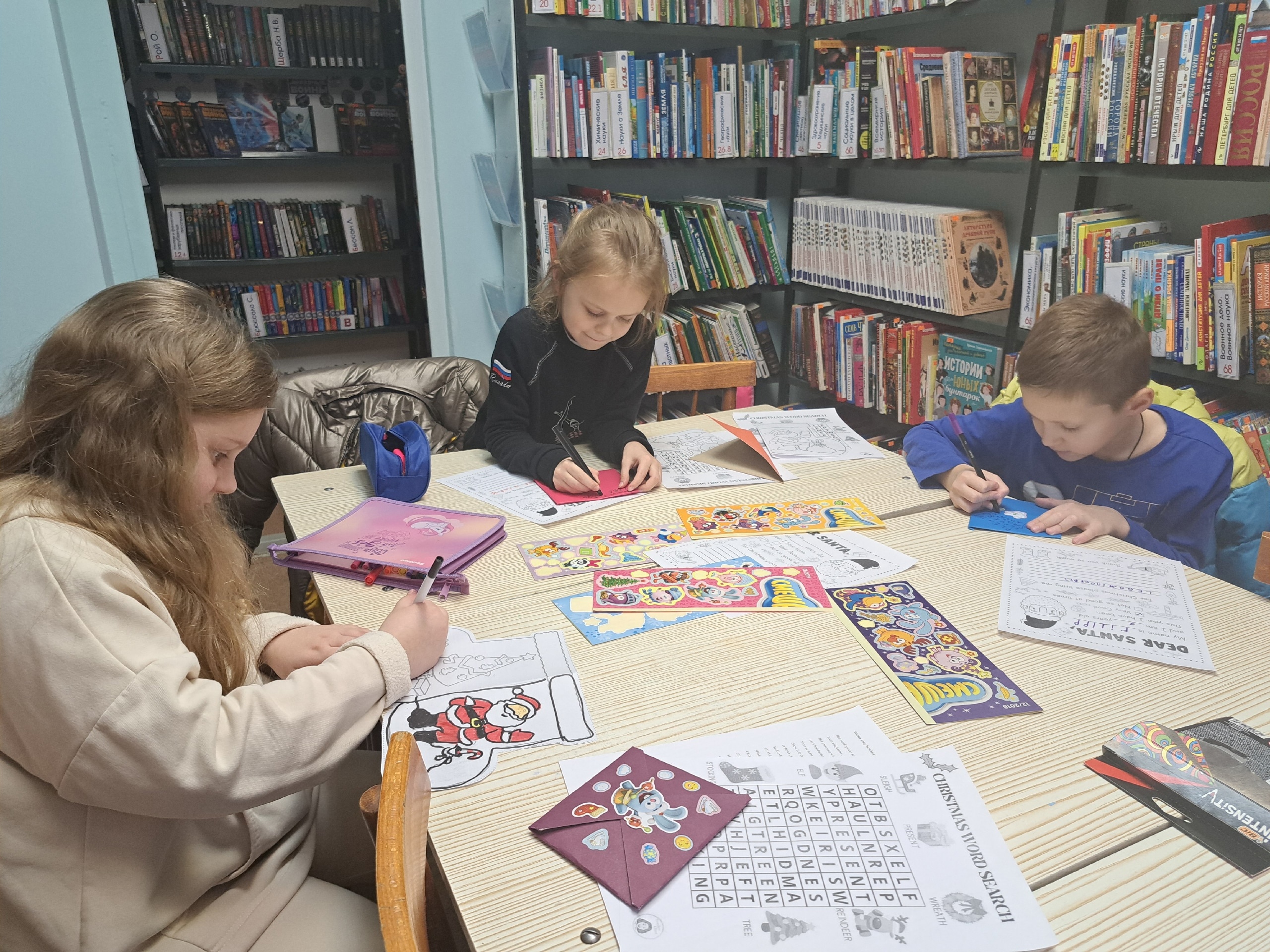 Ребята написали письмо Санта Клаусу, запечатали его в красивый новогодний конверт, сделали красочную открытку с изображением елочки и Санты, а также спели несколько новогодних песенок «Ten little elves» и «Winter song for children».