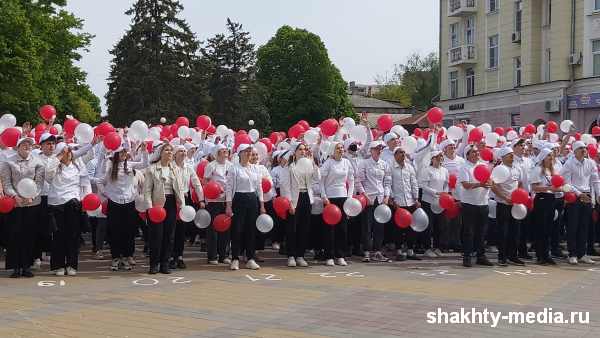 Студенты и старшеклассники построились в слова «Победа», «Спасибо», «Шахты», исполнили гимн России.