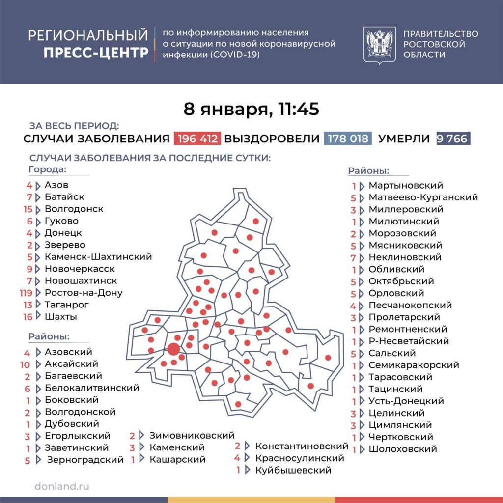 Новые инфицированные зарегистрированы в 52 городах и районах региона: в Ростове-на-Дону (119), Шахтах (16), Волгодонске (15), Таганроге (13), Аксайском (10) районе, Новочеркасске (9), Новошахтинске (7), Неклиновском (7) районе, Батайске (7), Гукове (6), Белокалитвинском (6) районе, Каменске-Шахтинском (5), Матвеево-Курганском (5), Зерноградском (5), Октябрьском (5), Орловском (5), Мясниковском (5), Сальском (5), Азовском (4) районах, Азове (4), Донецке (4), Песчанокопском (4), Красносулинском (4), Каменском (3), Егорлыкском (3), Миллеровском (3), Пролетарском (3), Целинском (3), Цимлянском (3), Багаевском (2), Волгодонском (2) районах, Звереве (2), Морозовском (2), Зимовниковском (2), Кагальницком (2), Константиновском (2), Куйбышевском (1), Ремонтненском (1), Тацинском (1), Боковском (1), Милютинском (1), Дубовском (1), Заветинском (1), Мартыновском (1), Обливском (1), Радионово-Несветайском (1), Семикаракорском (1), Кашарском (1), Тарасовском (1), Усть-Донецком (1), Шолоховском (1), Чертковском (1) районах.