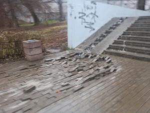 Из-за осадков повреждена плитка в районе надземного перехода.