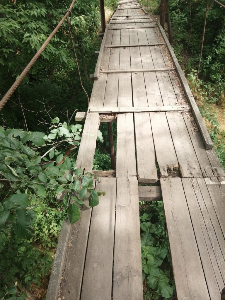 Сам мост нуждается в ремонте. Настил изготовлен из хлюпеньких досточек, приколоченных на ржавые гвозди. Местами досок нет совсем. То есть под ногами в прямом смысле слова зияют огроменные дыры!
