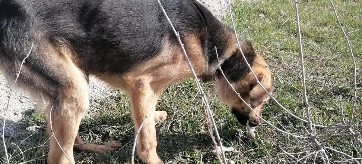 Об этом измученном пёсике волонтёры узнали от людей, которые видели животное около плотины в районе Рыбколхоза. Страдальца искали, но обнаружили не с первого раза. Потом на поиски ещё раз отправилась Юлия Адимова и нашла его. «Сказать, что пёс был истощён — это ничего не сказать, — рассказывает волонтёр. — Над ним издевались, возможно, даже хотели повесить (рана на шее была еще свежей).