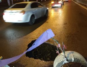Очевидцы опубликовали фото случившегося в соцсетях. На снимках видно, что перед с опасным участком установили небольшое ограждение, однако к вечеру ловушку для автомобилистов так и не залатали.