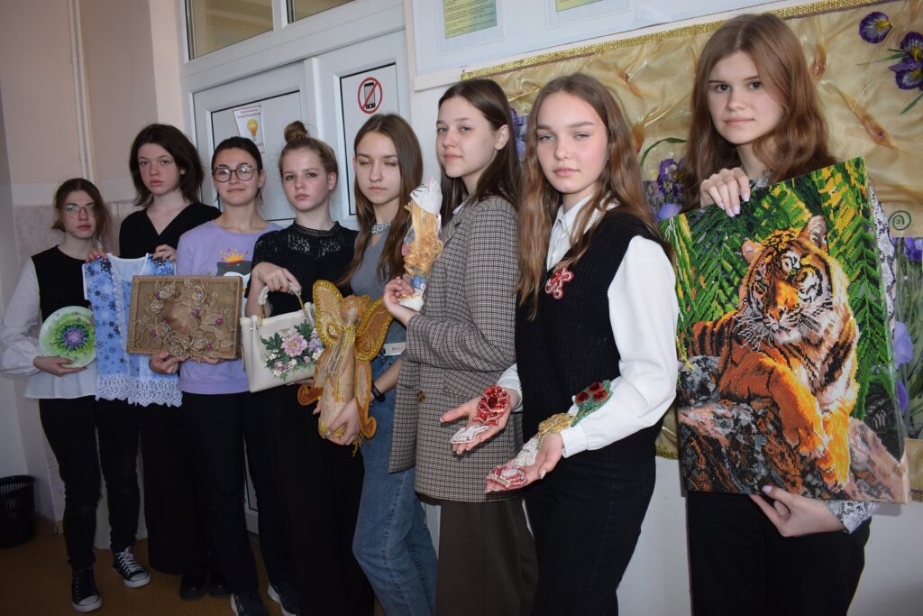Здесь главенствовали красота и гармония. Работы — самые разнообразные: от герба России, вырезанного из дерева, до мозаичных картин. К слову, мозаичные картины представительницы школы № 4 Ирины Кузнецовой удостоены первого места. Герб, сделанный руками учащегося лицея № 9 Никиты Проценко, и работа представлявшей ДПШ Татьяны Холошиной разделили второе место. Одежду восьмиклассницы из школы № 10 Карины Кисс украшали брошки из бисера. Очаровательные аксессуары девушка делает своими руками. Кроме удовольствия от возможности носить их самой и дарить друзьям, она получила диплом конференции третьей степени. Такие же награды — у учащейся школы № 7 Вероники Нетребиной и представительницы ДПШ Полины Пшонкиной.
