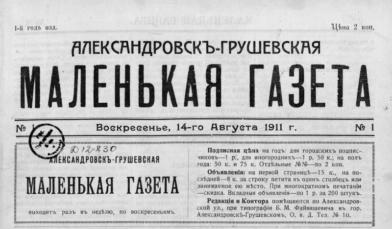 Первая газета в нашем городе вышла 14 августа 1911 года. Она называлась «Александровск-Грушевская маленькая газета». Издавалась на частные средства в типографии Горного инженера Б.М. Файвишевича.