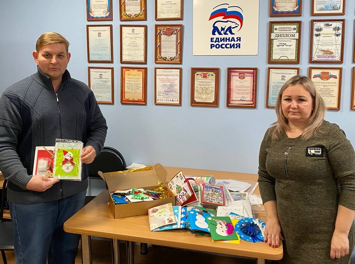 Школьники города Батайска передали в местное отделение «Единой России» более 250 самодельных открыток и писем с новогодними пожеланиями и словами поддержки для участников СВО.