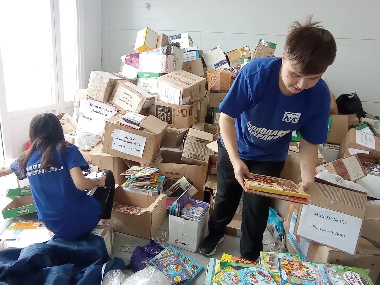 Молодогвардейцы разгрузили и рассортировали более 1500 пожертвованных книг: учебников, справочников, словарей, сказок, романов, а также другой литературы. Они были разделены на учебную и обычную русскую литературу.