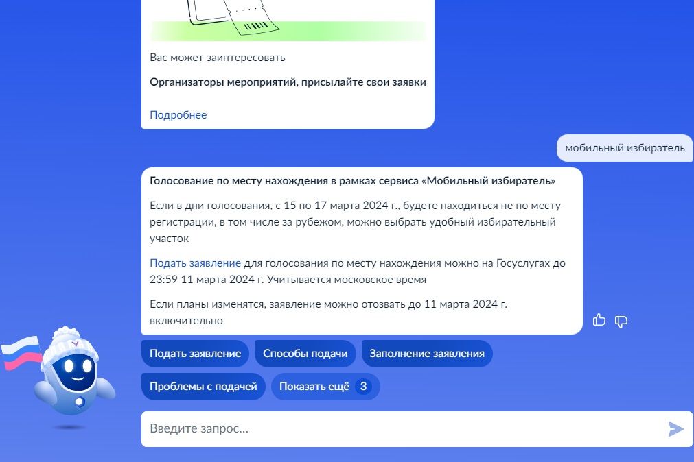 Так, если в день голосования вы не сможете посетить избирательный участок по месту прописки, то выберите другой удобный участок с помощью сервиса «Мобильный избиратель» на «Госуслугах». Приём заявлений продолжится на портале до 11 марта включительно. При этом если ваши планы снова изменятся, то вы сможете отозвать поданное заявление также до 11 марта 2024 года и проголосовать на участке, соответствующем вашему адресу регистрации по месту жительства, или же выбрать другой участок.
