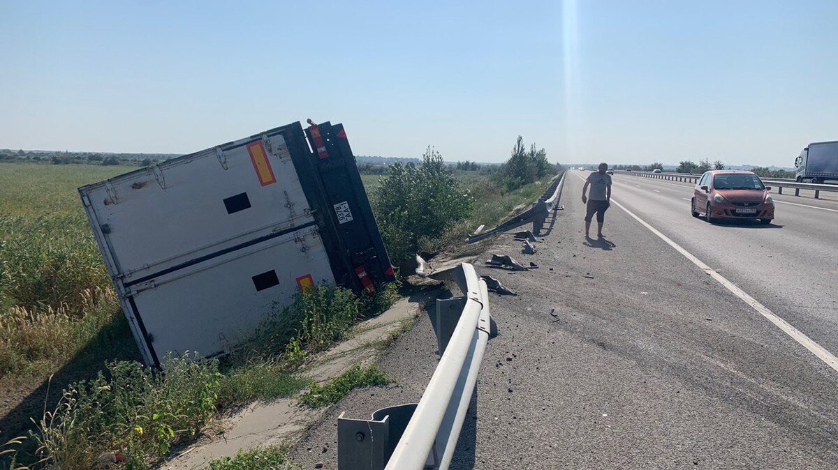 По предварительным данным, причиной аварии стало лопнувшее колесо, из-за которого большегруз влетел в металлическое ограждение, поехал на встречную полосу, потому наехал на еще одно ограждение и слетел в кювет, повалившись набок.