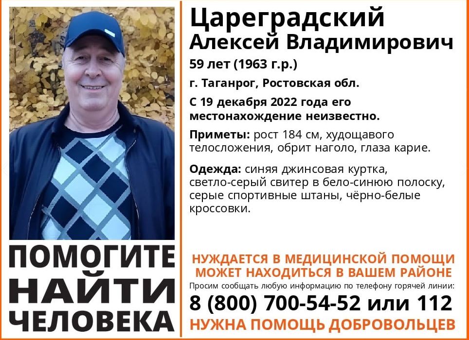 Ростовская область, 28 декабря 2022. DON24.RU. В Таганроге разыскивают без вести пропавшего 59-летнего Алексея Цареградского. Как сообщили в поисковом отряде «ЛизаАлерт», мужчина не выходит на связь с 19 декабря.