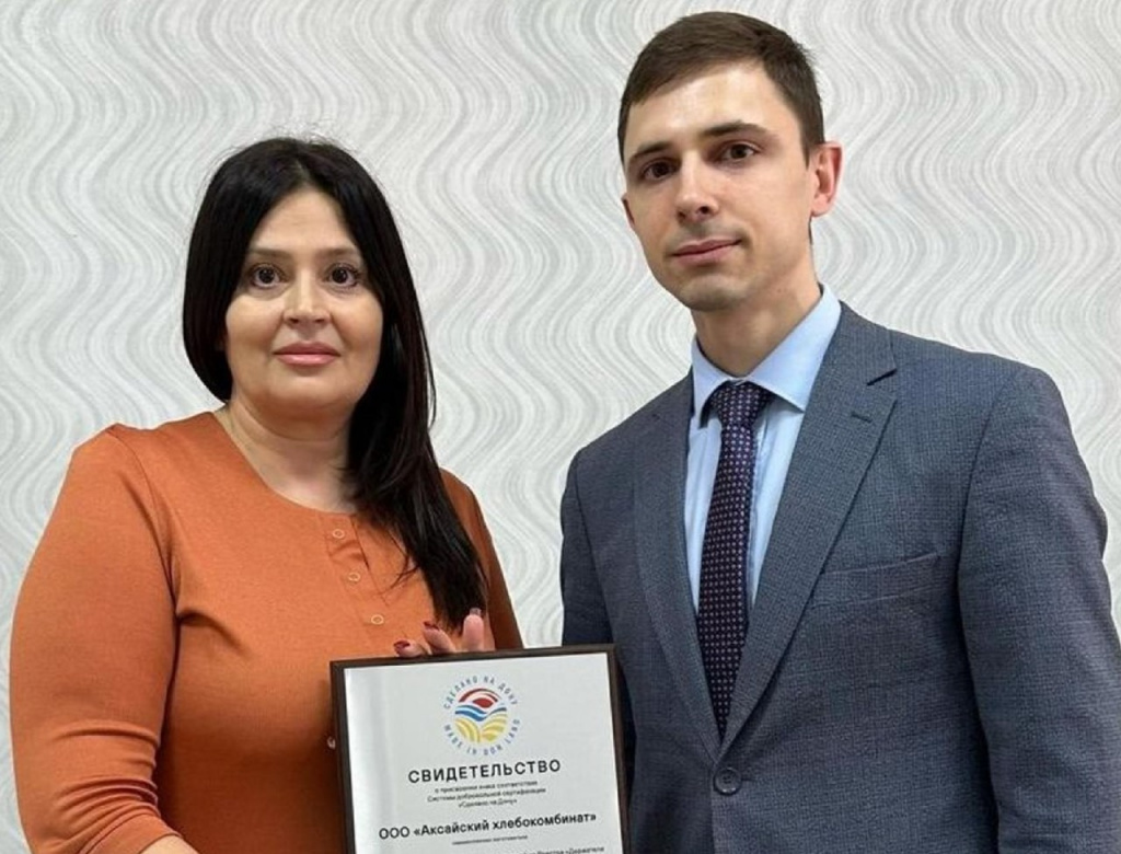 Заместитель директора Департамента потребительского рынка Ростовской области Виктор Сахранов вручил руководителю ООО «Аксайский хлебокомбинат» Надежде Назаренко свидетельство системы добровольной сертификации «Сделано на