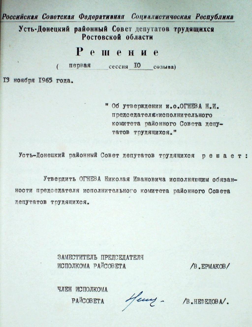 Исполняющим обязанности председателя исполкома Усть-Донецкого районного Совета депутатов трудящихся был утвержден Огнев Николай Иванович.