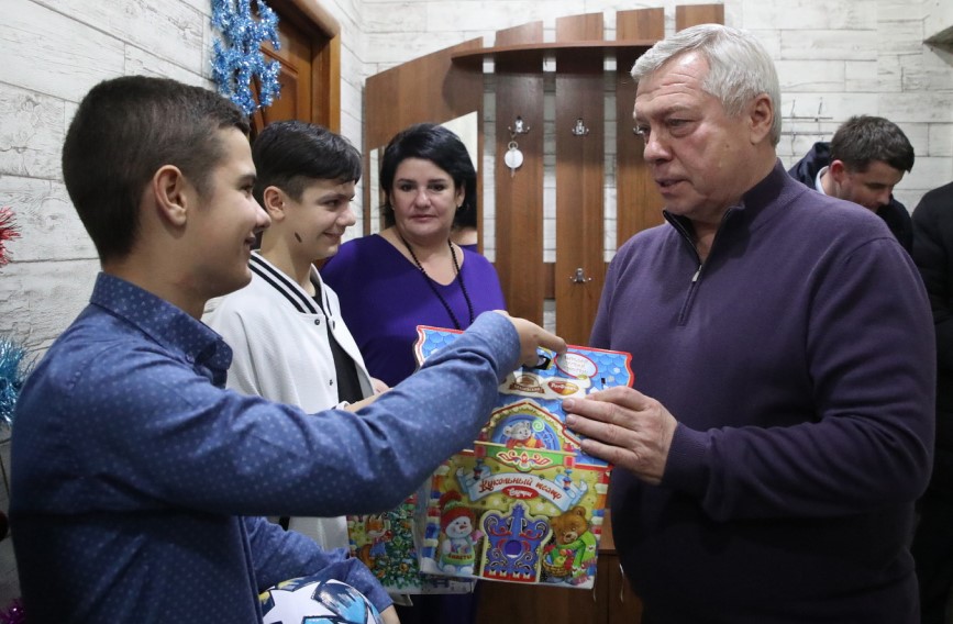 В Таганроге губернатор навестил Даниила, который загадал на «Ёлке желаний» получить к Новому году профессиональный фотоаппарат. Для брата Даниила, Анатолия, который увлекается спортом, тоже нашлись приятные сюрпризы футбольной тематики.