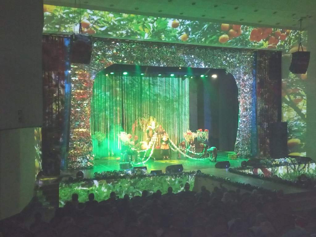 Мальчишкам и девчонкам, а также их мамам и сопровождающим, показали добрую, умную и необычайно увлекательную сказку «Королевство кривых зеркал». Детвора с затаённым дыханием следила за приключениями девочки Оли и её близняшки-отражении Яло в необычной стране, наполненной кривыми зеркалами и несправедливостью. Режиссёры и актёры осовременили сказку, написанную в середине прошлого века, с помощью ярких декораций, массовых вокально-хореографических вставок с элементами шоу, добавив волшебства и юмора.