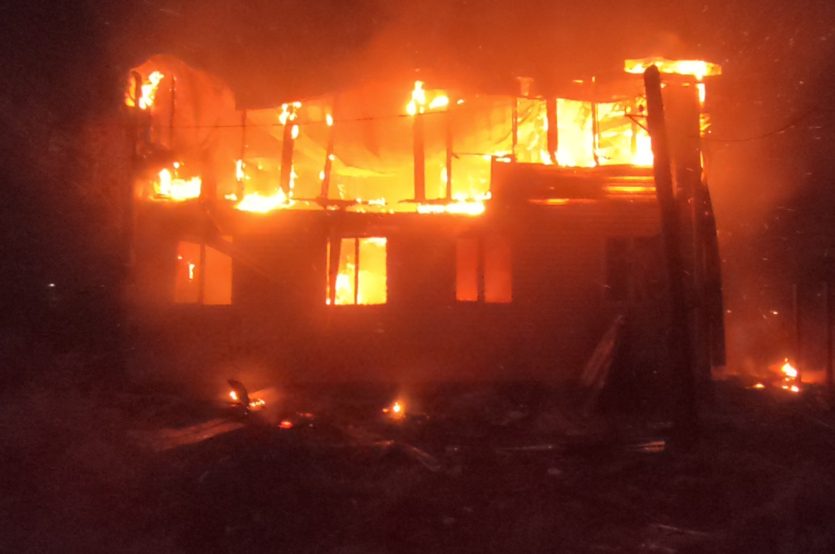 По прибытии было установлено, что горит двухэтажное неэксплуатируемое здание пятой степени огнестойкости практически по всей площади, имелась реальная угроза распространения пожара на рядом стоящее жилое здание.