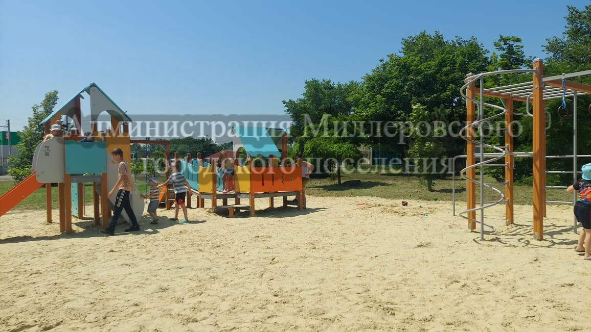 Вчера администрацией Миллеровского городского поселения было завершено обустройство детской площадки на ул. Советской, осталось только установить лавочки и урны в зоне отдыха, а также подключить освещение.