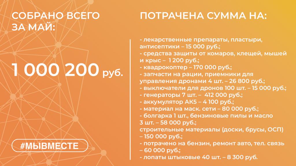 Эти деньги потрачены на приобретение материала для маскировочных сетей (80 000 руб.), строительного материала (150 000 руб.), лекарственных препаратов (15 000 руб.), генераторов (7 шт. – 412 000 тыс.), штыковых лопат (40 шт. – 8 300 руб.), болгарки и трёх бензопил (58 000 руб.), запчастей на рации, приемников для управления дронами (4 шт. – 26 800 руб.), выключателей для дронов (100 шт. – 15 000 руб.), адресно был приобретен квадракоптер (170 000 руб.), средства защиты от комаров, клещей, мышей и крыс (1 200 руб.), аккумулятор АК5 (4 100 руб).