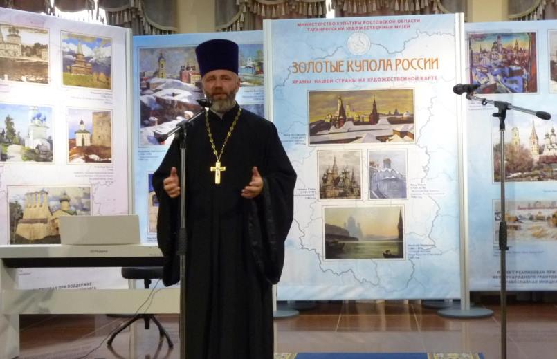 Православный храм – место особенное, он – как небо на земле, — напомнил он. — Самые священные и важные моменты жизни человека тесно связаны с храмом: мы, когда рождаемся, – принимаем в храме Крещение, потом венчаемся, исповедуемся, причащаемся. И душа наша чувствует здесь присутствие Божие. И я рад, что благодаря проекту «Золотые купола России» о храмах, о храмовой архитектуре, об их отражении в живописи узнает больше людей, в особенности – молодых.Заместитель главы администрации Таганрога по социальным вопросам Ирина Голубева в своем приветствии отметила, что данный проект позволит музею выполнять сразу несколько миссий: культурно-просветительскую, эстетическую, образовательную, духовную.