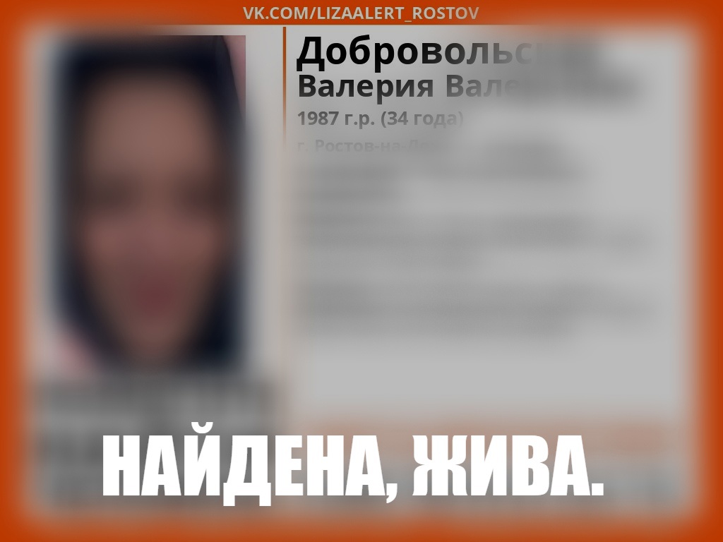 7 мая таганроженку удалось найти. Об этом сообщает поисковый отряд «Лиза Алерт Юг». Сейчас жизни и здоровью Валерии ничего не угрожает. Она передана родственникам. Где женщина находилась четыре дня, не говорится.