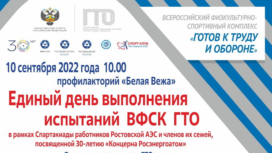 Ростовская АЭС совместно с Центром тестирования ГТО города Волгодонска, приглашает работников Ростовской АЭС и членов их семей принять участие в Едином дне выполнения испытаний Всероссийского физкультурно-спортивного комплекса Готов к труду и обороне. Спортивный праздник проходит в рамках Спартакиады работников Ростовской АЭС и посвящен 30-летию «Концерна Росэнергоатом».