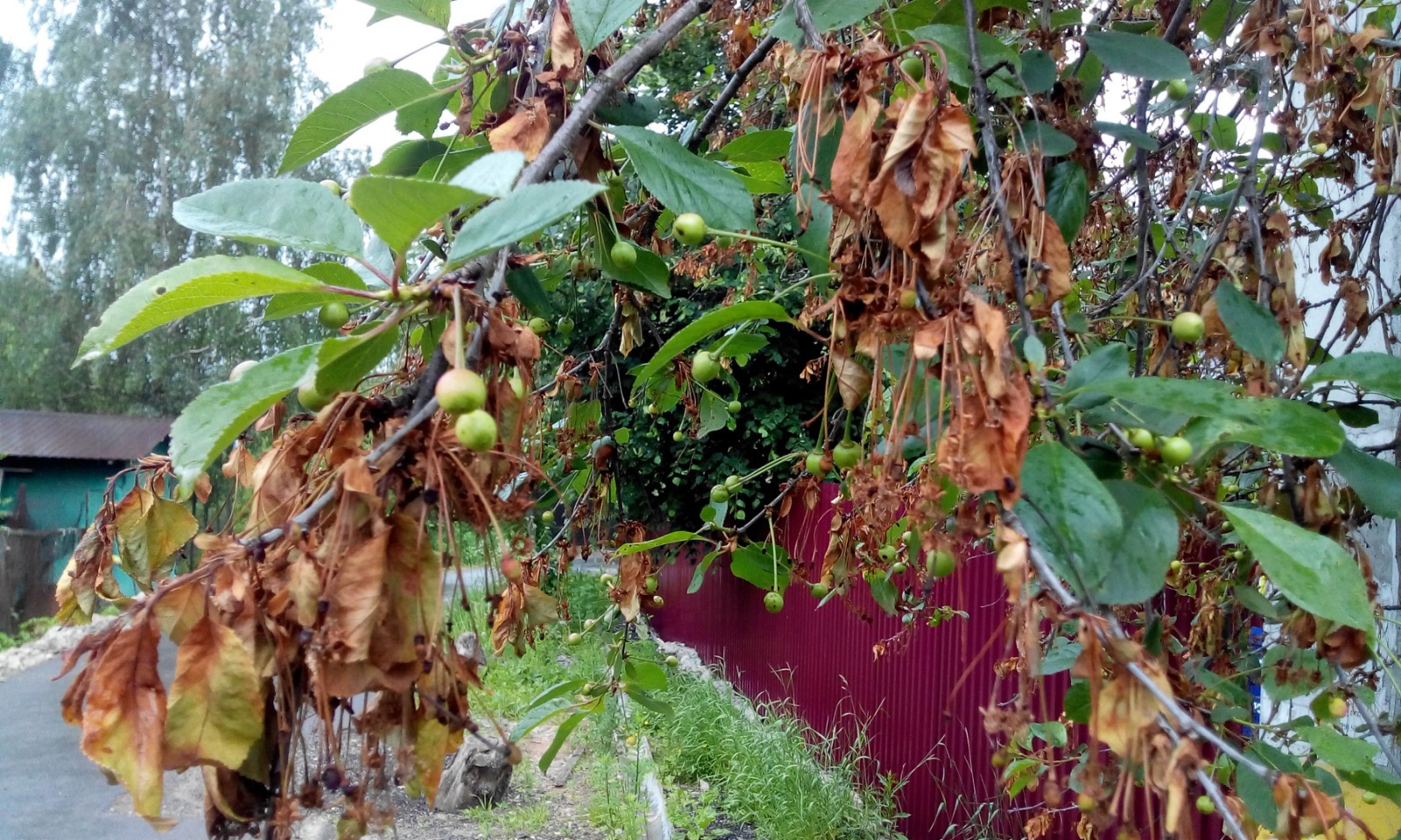 - при коккомикозе и клястероспориозе (дырчатой пятнистости) на верхней стороне листовой пластинки образуются мелкие округлые коричневые или темно-бурые пятна (для клястероспориоза характерно наличие красно-бурой или малиновой каймы вокруг них), впоследствии происходит выпадение ткани листа по периметру пятна и образование в листе многочисленных дырочек. Такие же пятна образуются на плодоножке, на ягодах, на побегах и почках, что вызывает растрескивание, камедетечение, однобокое усыхание плодов, листва с сильно пораженных деревьев может преждевременно желтеть и опадать, что сильно ослабляет деревья. Плоды персика и абрикоса покрываются коростинками – бородавками, а у вишни и черешни образуются вдавленные темные пятна, прилипающие к косточке.