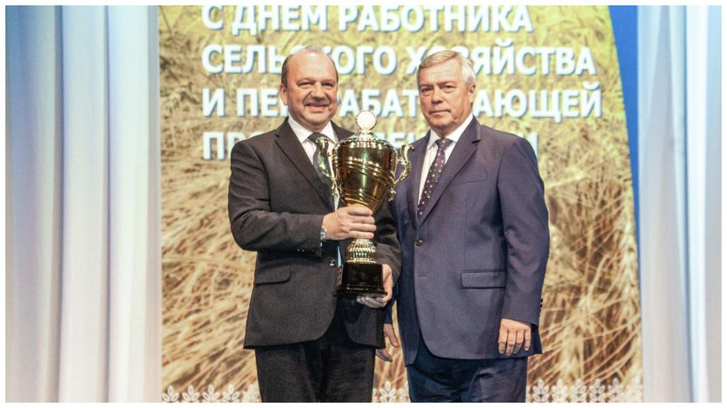 Переходящий кубок лидера уборочной страды главе Администрации района Виктору Гуснай вручил Губернатор Василий Голубев, таким образом наш район третий год подряд стал лучшим в своей зоне, и теперь переходящий кубок останется в районе навсегда.