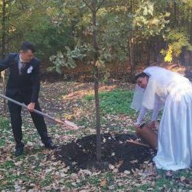 На территории Дубков продолжился осенний День древонасаждений: саженцы дубов высадили молодожены.