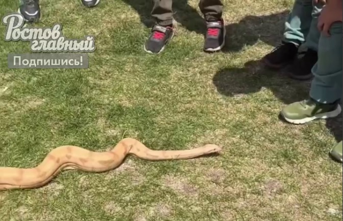 Очевидно, владелец вывел хладнокровного ползучего питомца погреться на весеннем солнышке. На кадрах видно, что красавец привлёк внимание местной ребятни. Детвора с восторгом, но настороженно отреагировала на ползающего по травке гада.