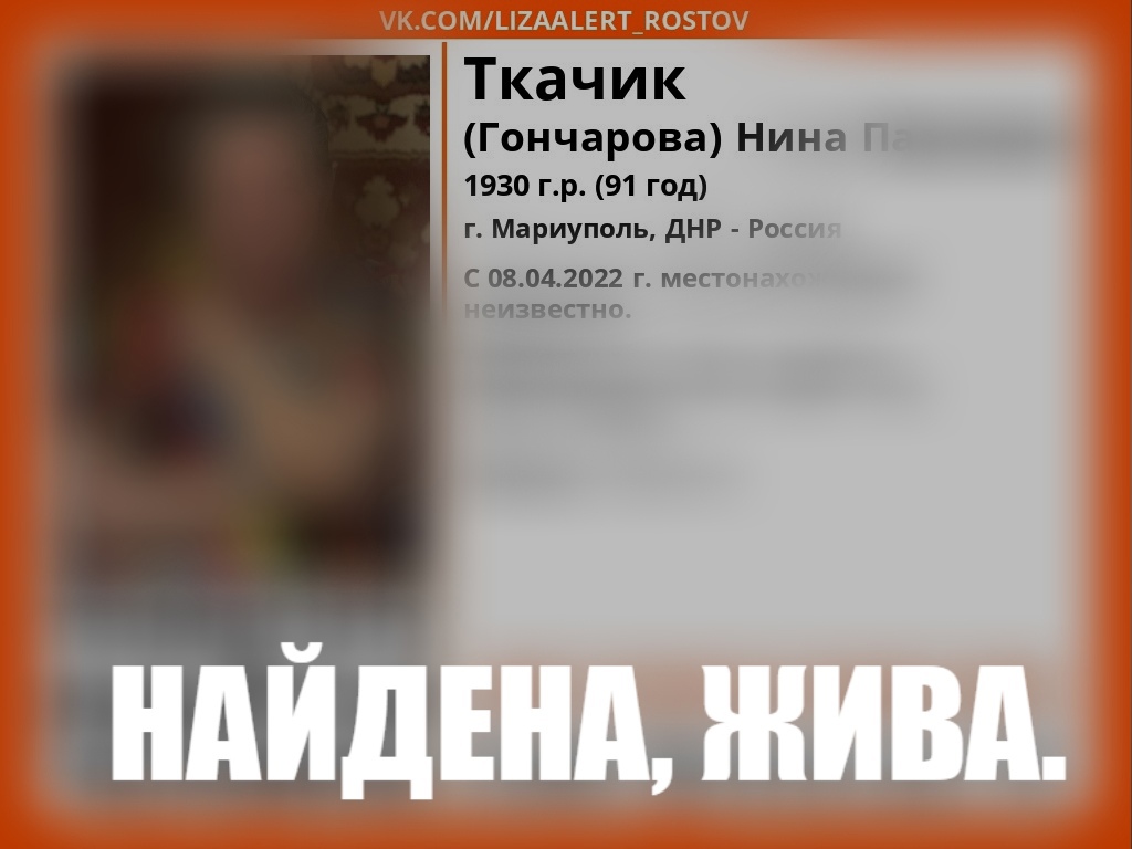 Ранее мы сообщали, что 91-летняя Нина Павловна Ткачик из ДНР пропала 8 апреля. С тех пор о ней не поступало никаких сведений. Вчера вечером на странице добровольческого отряда ВКонтакте появилось сообщение о том, что женщину нашли живой.