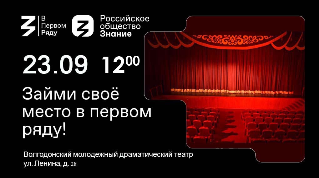 23 сентября Волгодонский молодежный драматический театр принимает эстафету Всероссийской акции «В первом ряду», посвященной театральному искусству. Организатор мероприятия — Российское общество «Знание», которое создает федеральные просветительские проекты для молодежи по всей России.