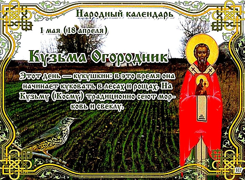 В этом году 1 мая Православная церковь отмечает день памяти святителя Космы, исповедника, епископа Халкидонского (820-850 гг.). Так же на этот день выпадает Красная горка или Антипасха. В народном календаре эта дата получила названия Кузьма огородник. По приметам на 1 мая судили о погоде в наступившем месяце.