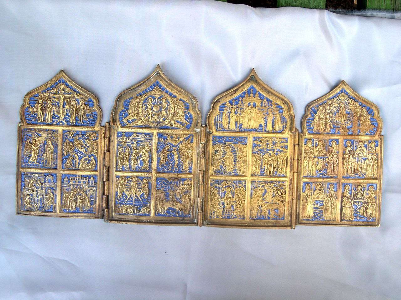 Складень четырехстворчатый "Двунадесятые праздники" Россия, XVIII в. 1700-1800 Складень состоит из четырех створ, в клеймах первой створы изображение: «Благовещение», «Рождество Христово», «Рождество Богородицы», «Введение Богородицы во храм». Находится в фондах НМИДК.