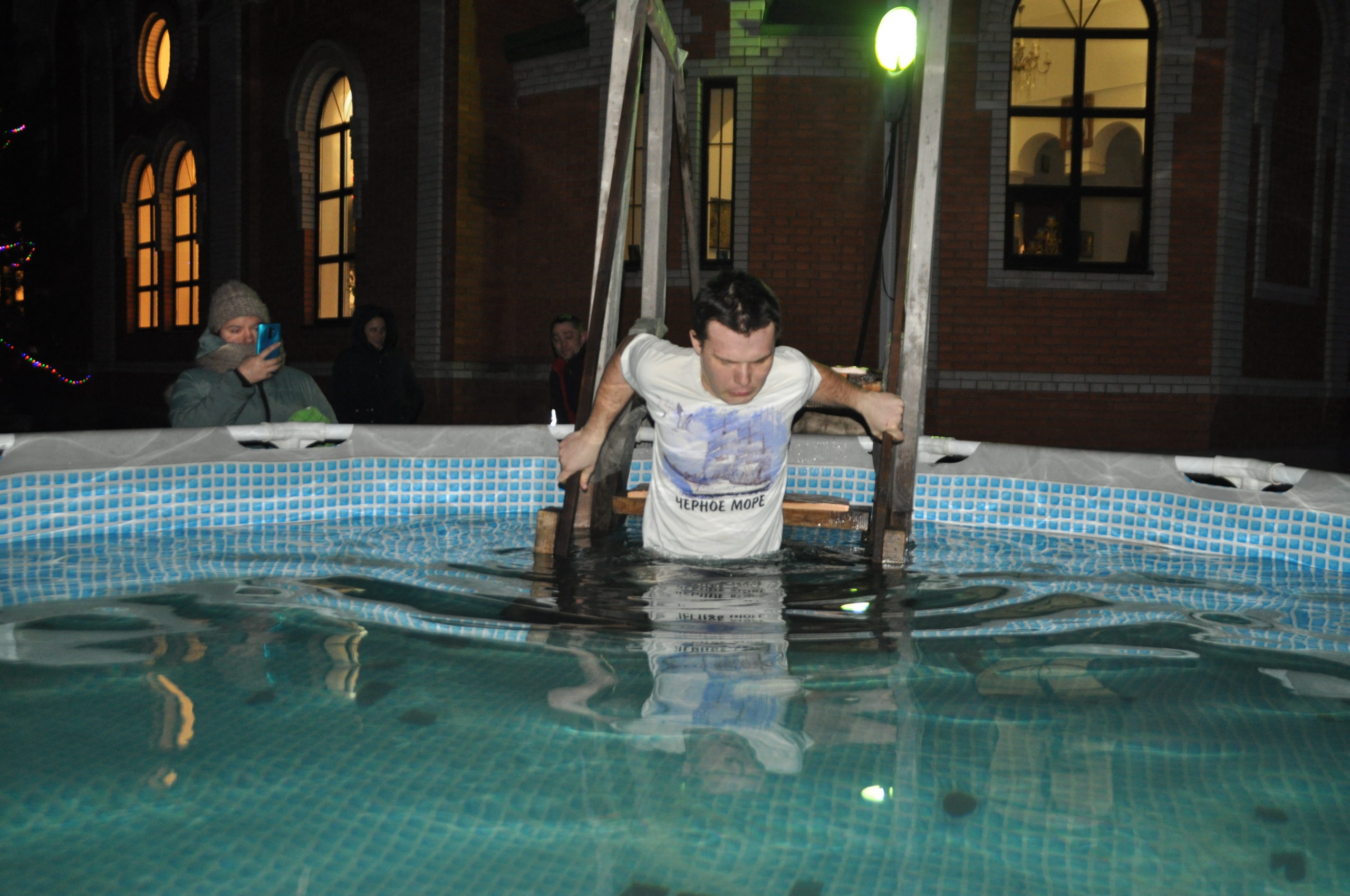 Поздним вечером 18 января храмы Донецка после богослужений опустели. Впереди большой праздник – Крещение Господне и основные торжества намечены на этот день. Однако некоторые дончане решили окунуться в Иордань, которую установили на территории Державного храма, именно в среду. Некоторые из решившихся на такой, можно сказать, отважный шаг попали в объектив наших корреспондентов.
