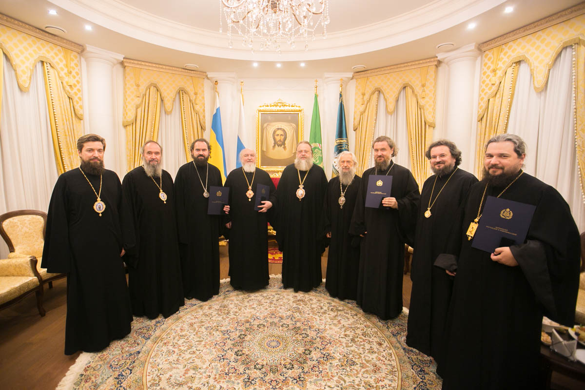 В соборных палатах Ростовского кафедрального собора Рождества Пресвятой Богородицы за братском общением митрополит Ростовский и Новочеркасский Меркурий вручил награды архиереям, участвовавшим в сборах гуманитарной помощи жителям Донбасса и беженцам, прибывшим на территорию Ростовской области.