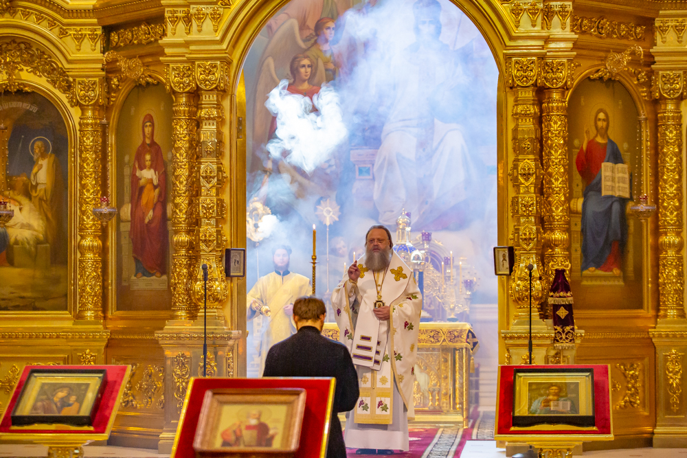 Его Высокопреосвященству сослужили настоятель собора иерей Леонтий Дмитриев, духовник епархии протоиерей Николай Урывский, секретарь Епархиального управления Ростовской-на-Дону епархии иерей Димитрий Болотаев, епархиальный древлехранитель иеромонах Маврикий (Звягинцев), клирики епархии.